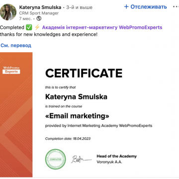 Как может выглядеть ваше резюме после прохождения курса Специалист по Email маркетингу? После 6 недель обучения вы сможете овладеть профессией Email-специалист, средняя зарплата которого $500 (по Киеву) за проект, а таких одновременно можно вести несколько
