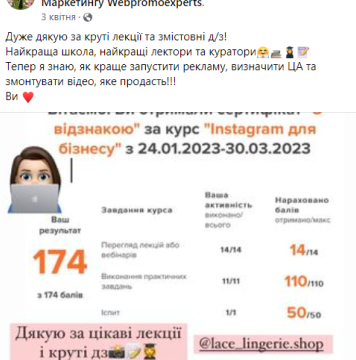 - Студенты курса защищают свой проект, демонстрируют проработанную комплексную стратегию продвижения бизнеса в Instagram, получают обратную связь от куратора и рекомендации по дальнейшему развитию стратегии продвижения