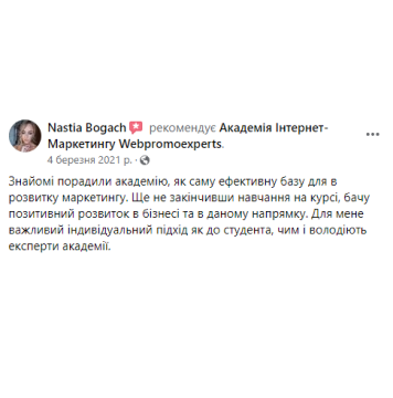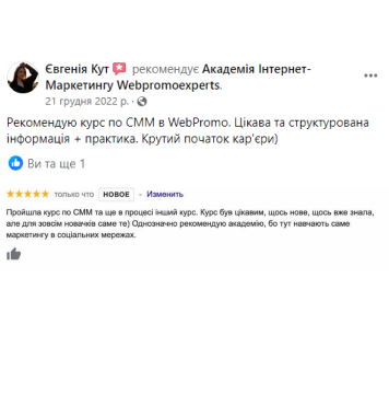 Леся має вищу психологічну освіту, що дозволяє краще зрозуміти аудиторію в соцмережах та створити контент, що досягає цілей бізнесу. Саме цьому вона навчає своїх студентів на курсах Академії: "SMM-спеціаліст", "Спеціаліст з інтернет-макетингу" та "Контент-маркетинг".
