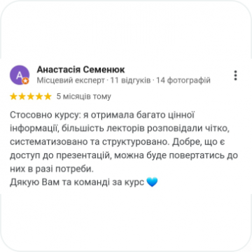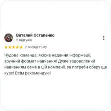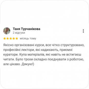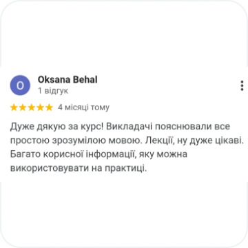Після закінчення курсу, всі лекції, скринкасти, конспекти та презентації на сайті будуть доступні для перегляду 1 рік. Ви зможете повернутись до них в будь-який момент у вашому Особистому кабінеті